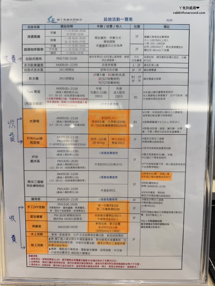 - 游泳池時間:14:00~18:00(13:00~14:00清潔保養 );6~9月限定延長開放至20:00