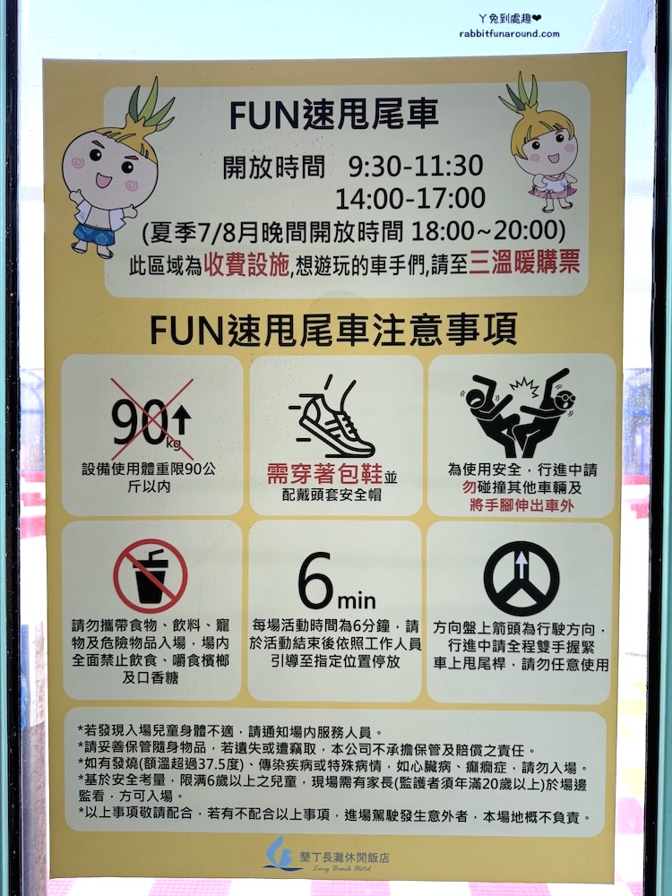 - 賽車場時間:09:30~11:30;14:00~17:00;7~8月限定延長開放18:00~20:00
