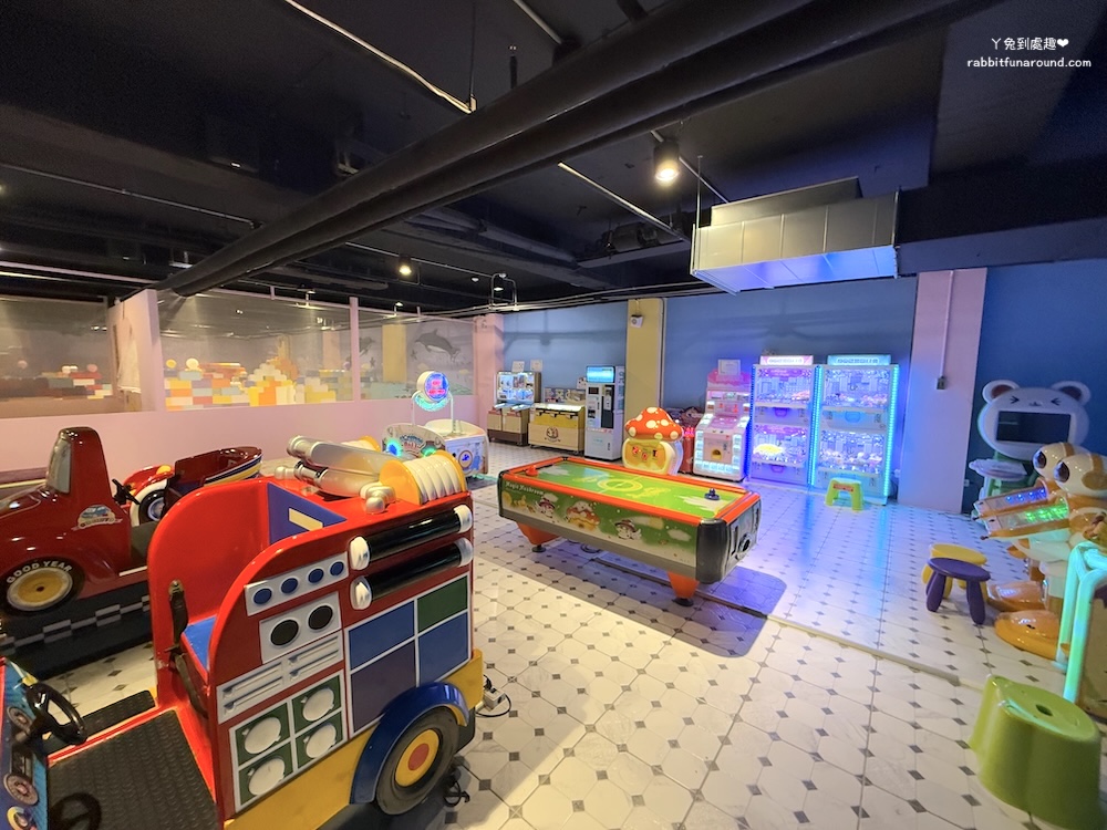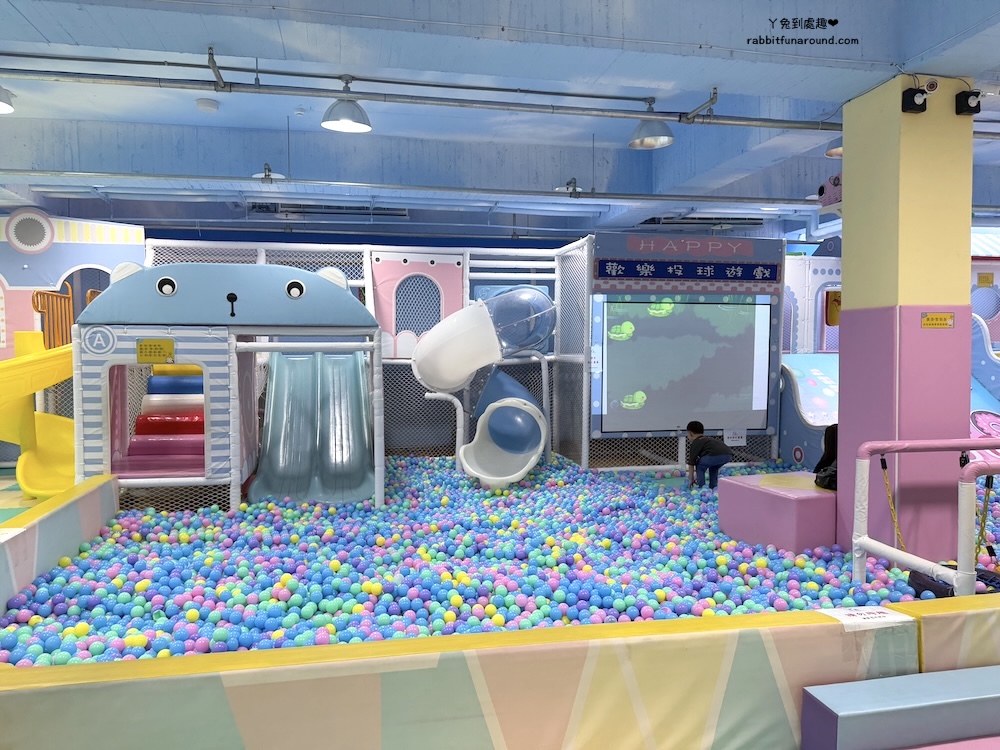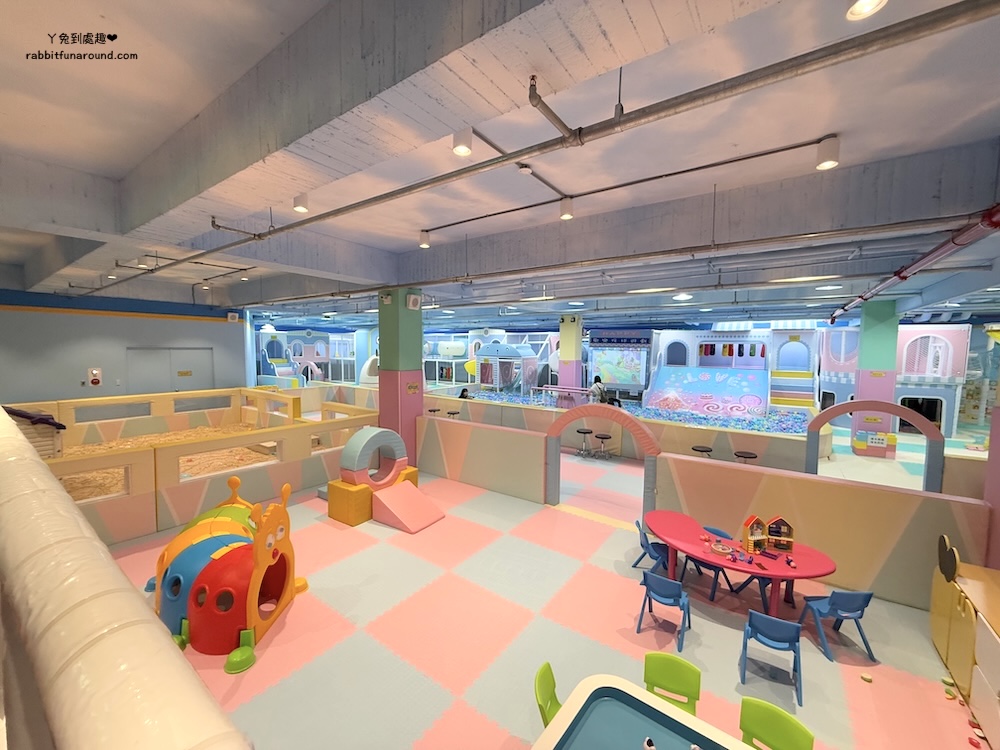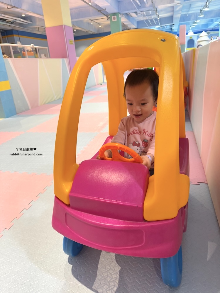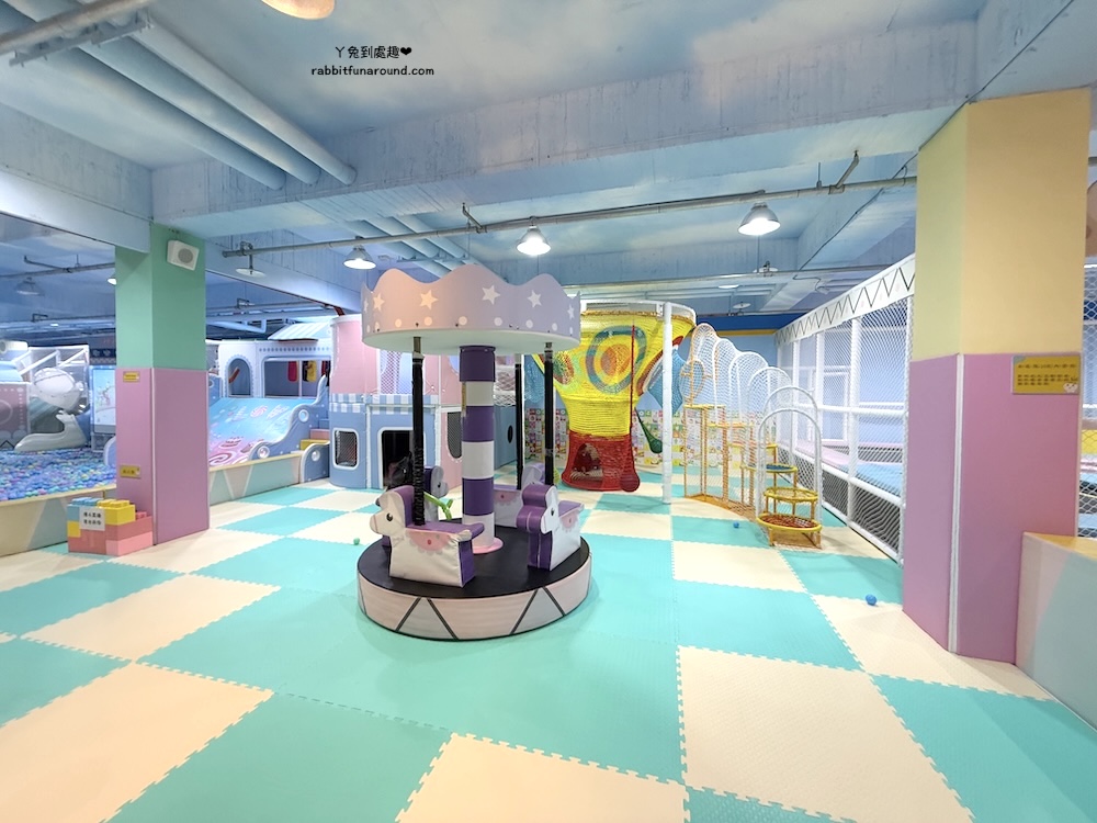 兒童遊戲區分很多區域,有辦家家酒區、適合0~1歲寶寶的爬行區,球池、旋轉木馬、玩沙區、彈跳床、磐岩、投幣式設施。