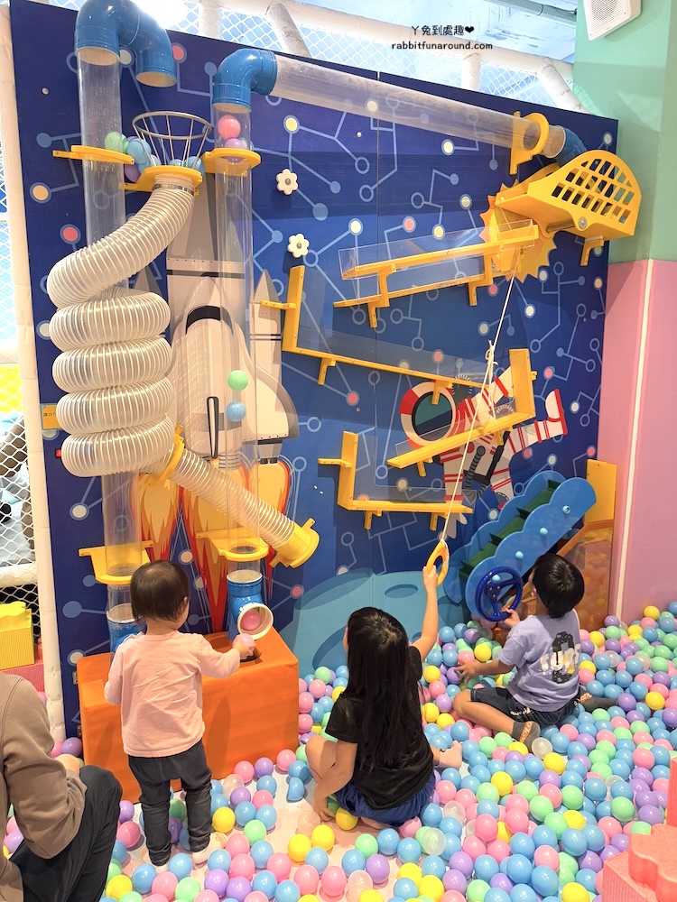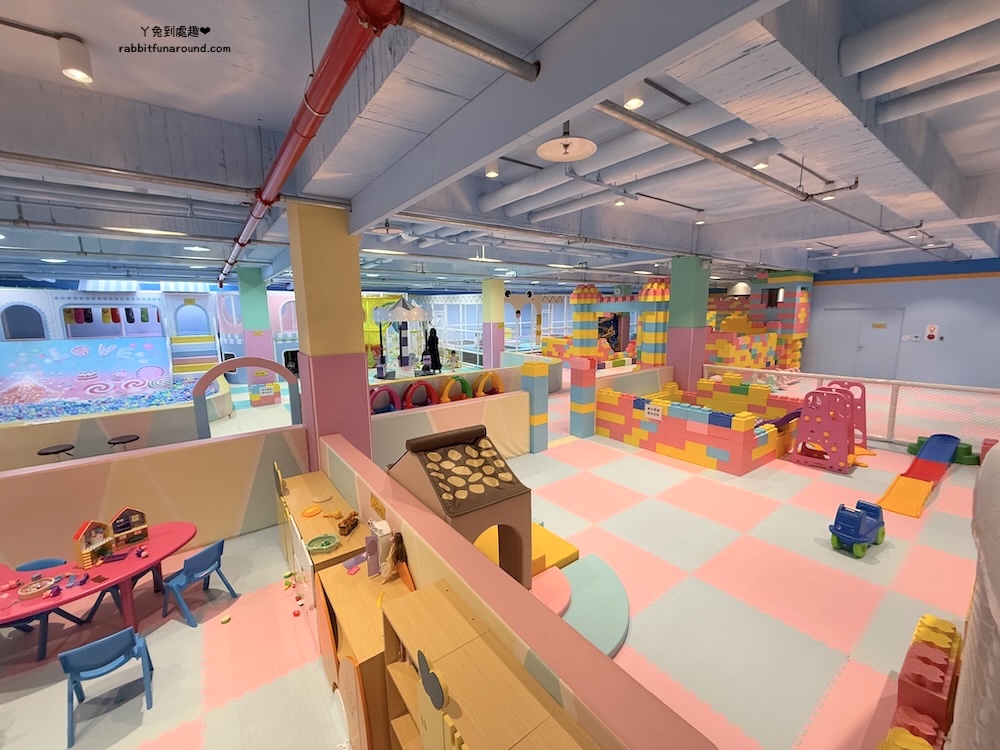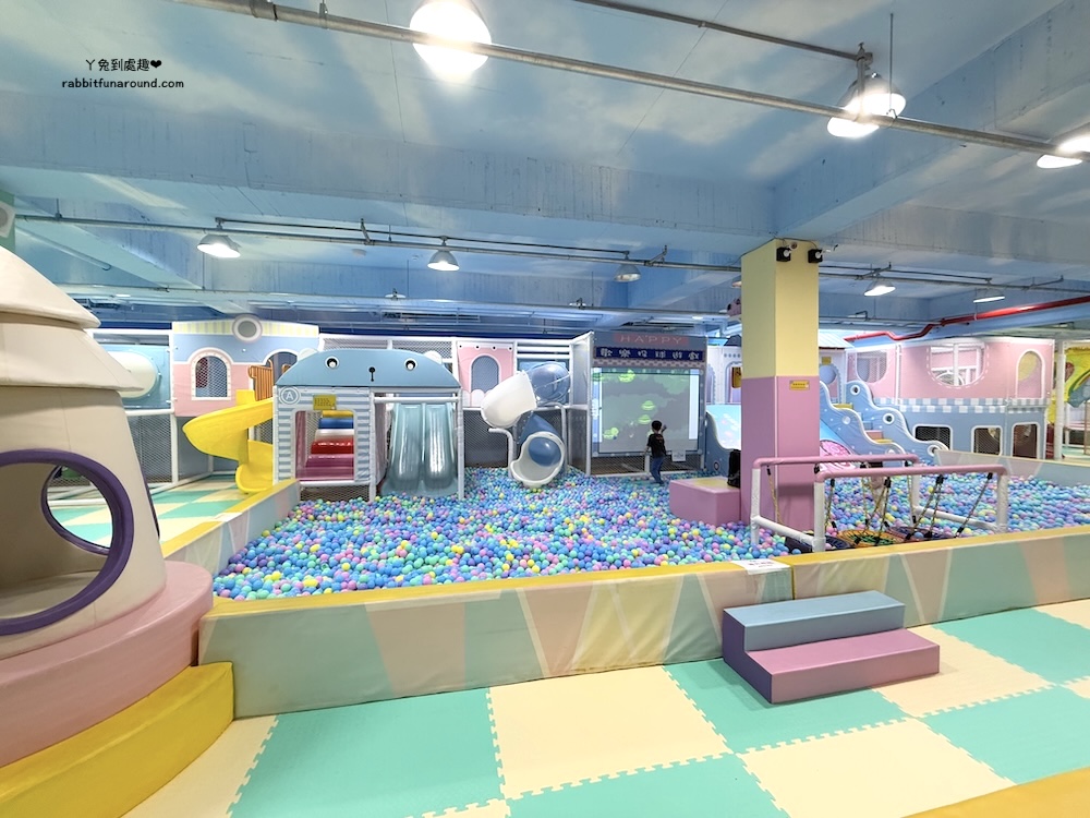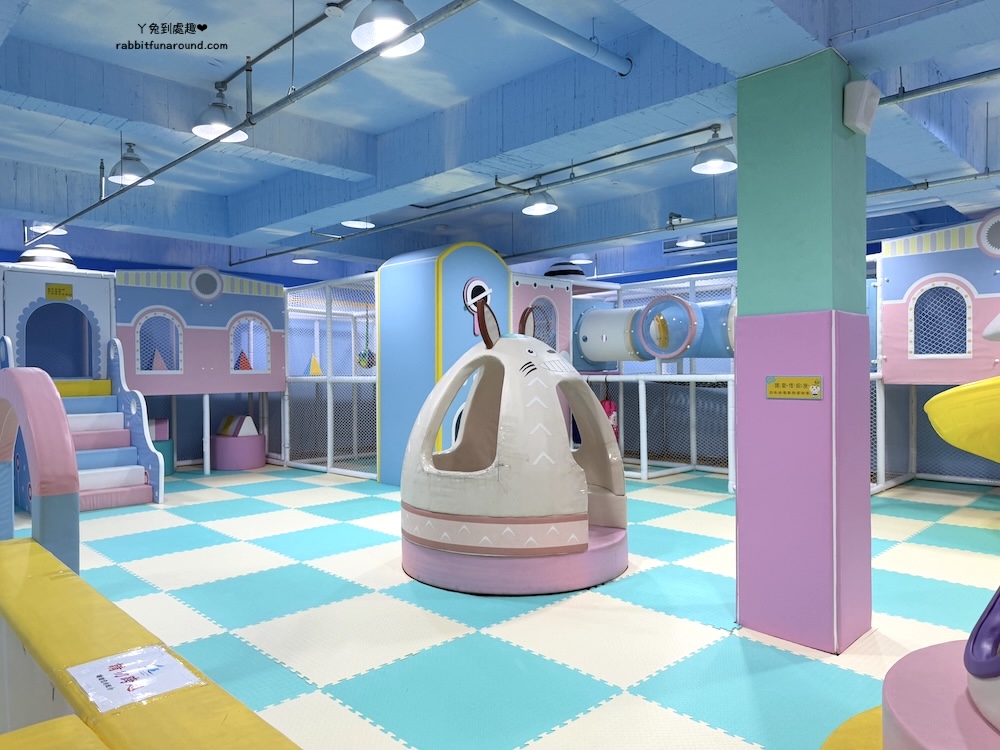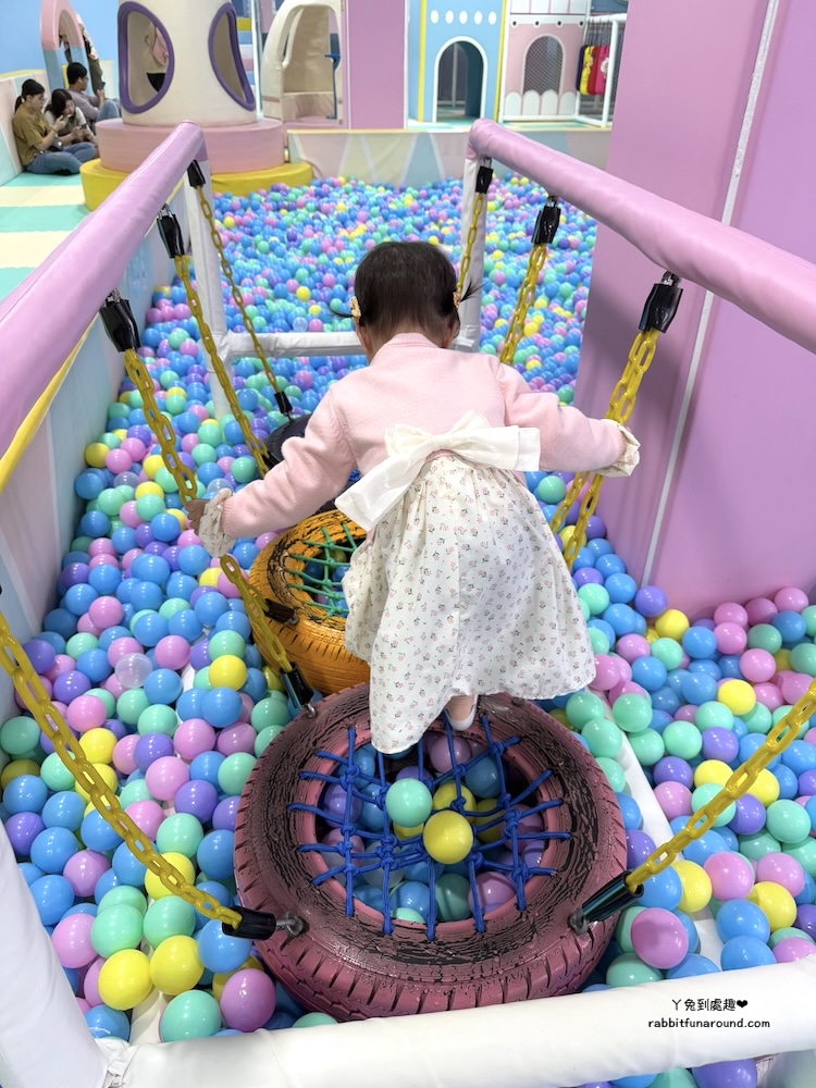 兒童遊戲區分很多區域,有辦家家酒區、適合0~1歲寶寶的爬行區,球池、旋轉木馬、玩沙區、彈跳床、磐岩、投幣式設施。
