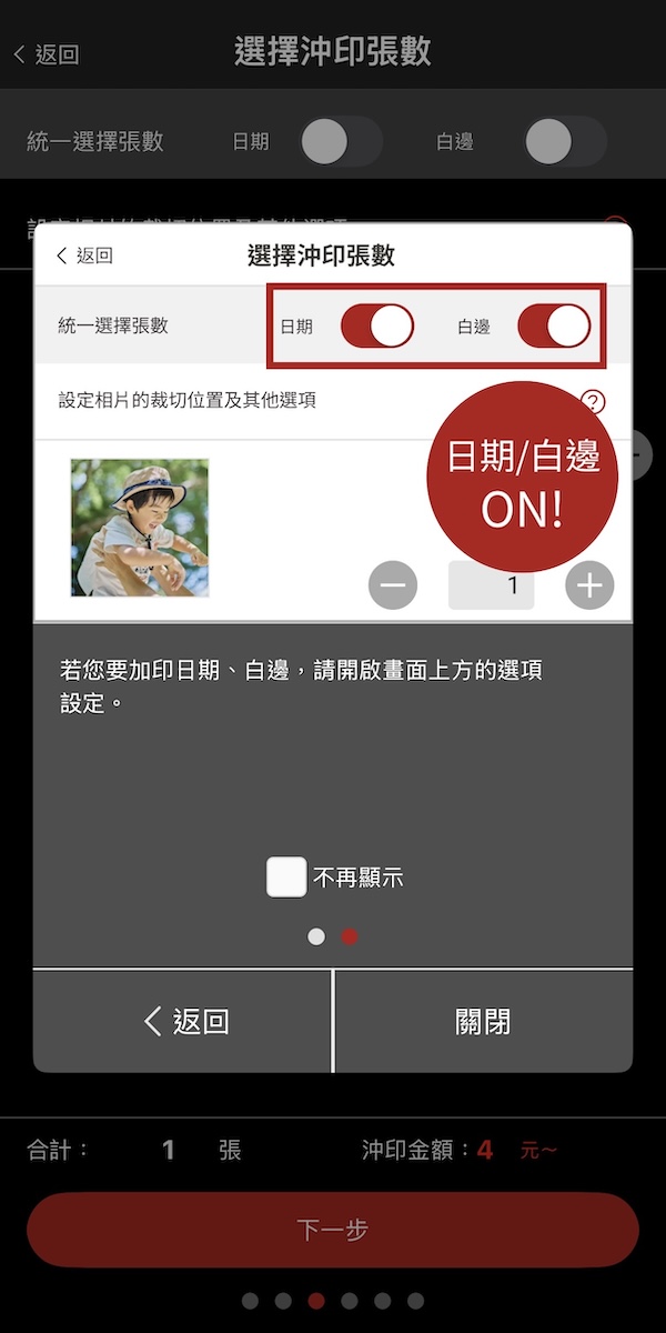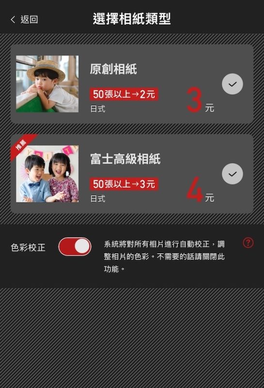 我個人選的是「日式尺寸(3.5*5)」、「富士高級相紙」,超過50張以上從4元降成3元,CP值超高。