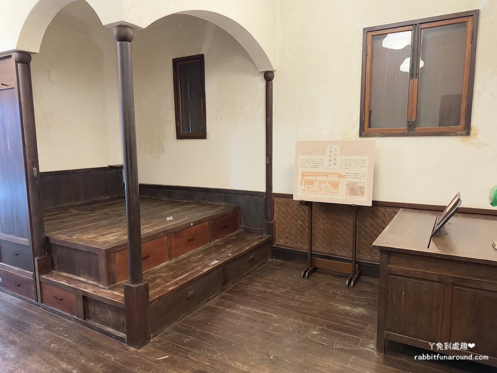 二樓主要展示大谷光瑞的起居空間,包含:寢室、食堂、炊事房、書齋、製圖室、婦人室…等多個房間,是當代少見的豪宅別墅等級。